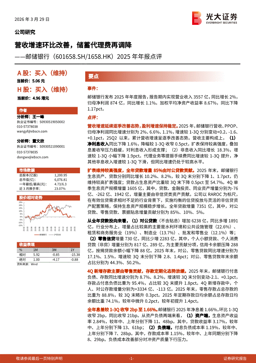邮储银行:光大证券-邮储银行-601658-2025年年报点评:营收增速环比改善,储蓄代理费再调降-260329