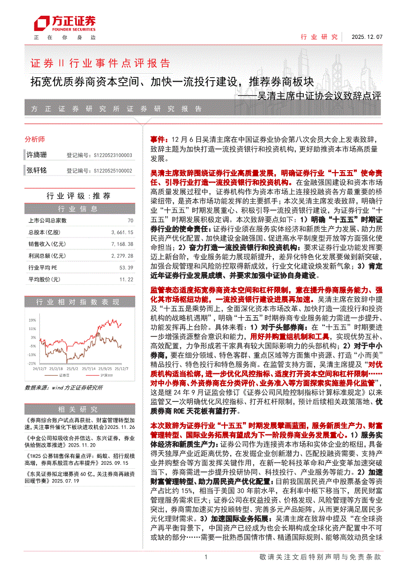 证券行业:方正证券-证券Ⅱ行业事件点评报告:吴清主席中证协会议致辞点评,拓宽优质券商资本空间、加快一流投行建设,推荐券商板块-251207