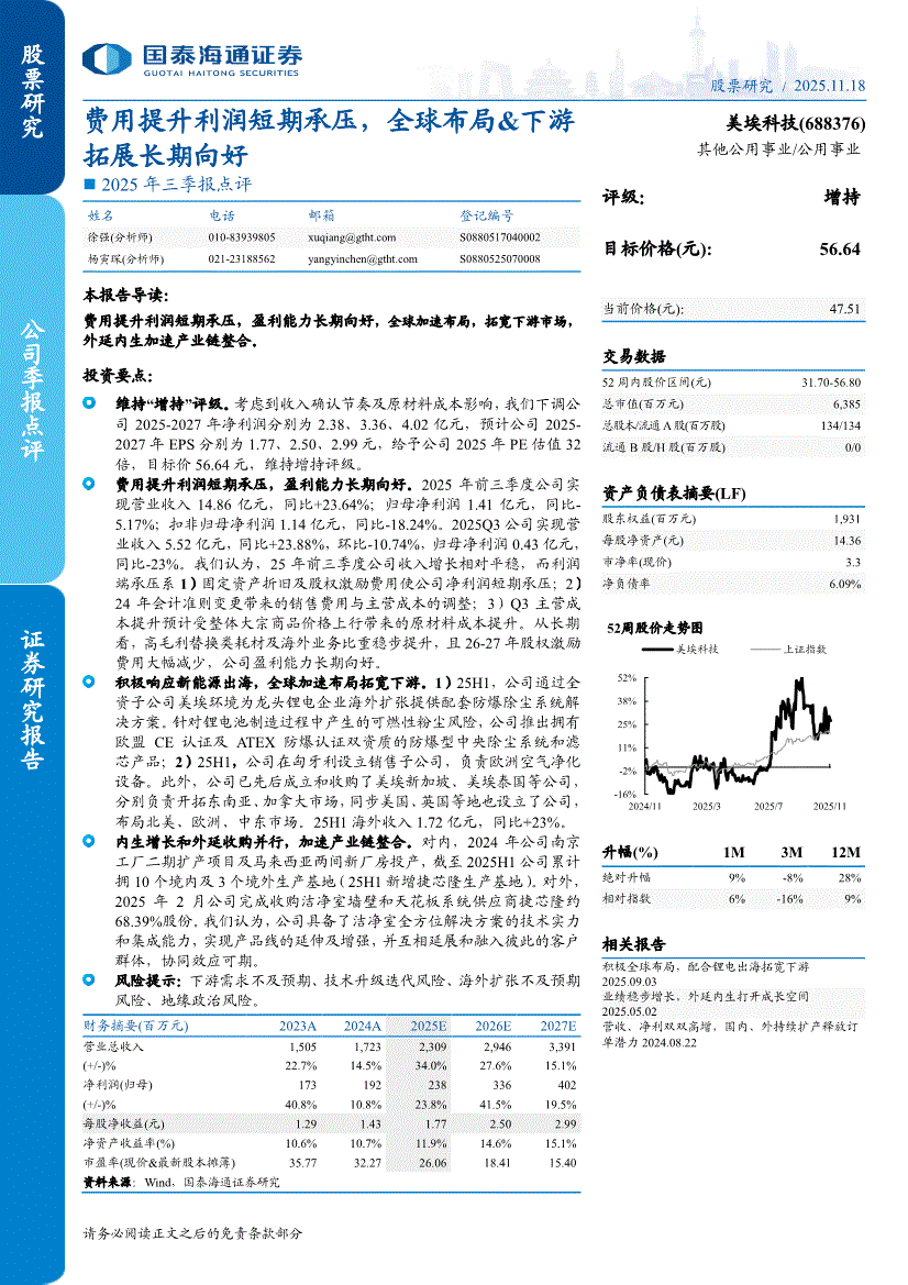 美埃科技:国泰海通证券-美埃科技-688376-2025年三季报点评:费用提升利润短期承压,全球布局&下游拓展长期向好-251118
