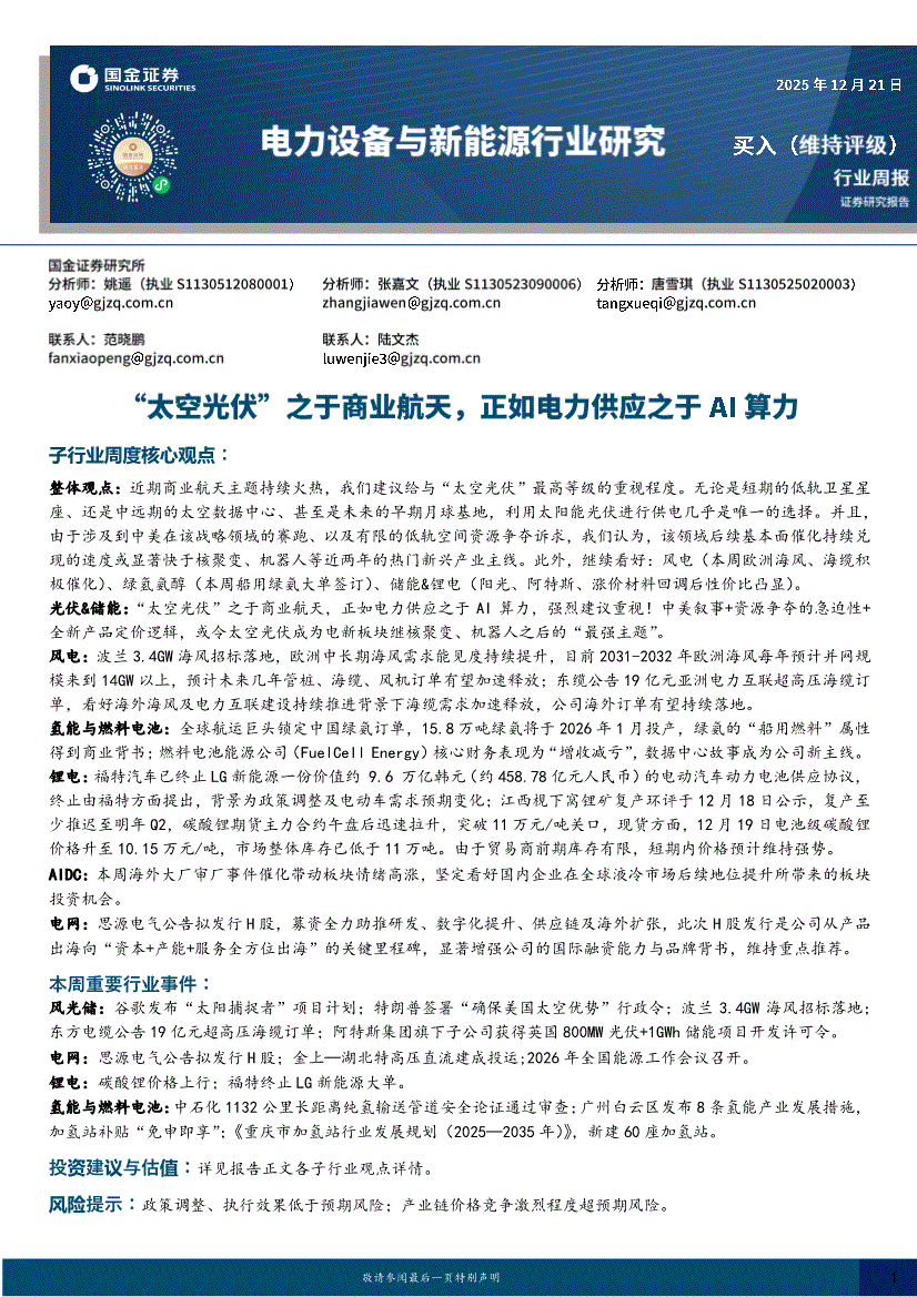 电力设备与新能源行业:国金证券-电力设备与新能源行业:“太空光伏”之于商业航天,正如电力供应之于AI算力-251221