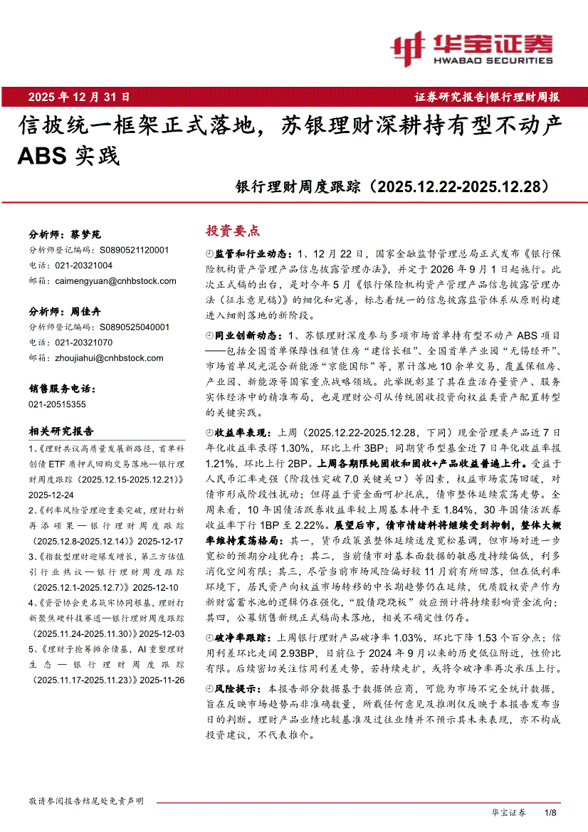 银行业:华宝证券-银行业理财周度跟踪:信披统一框架正式落地,苏银理财深耕持有型不动产ABS实践-251231