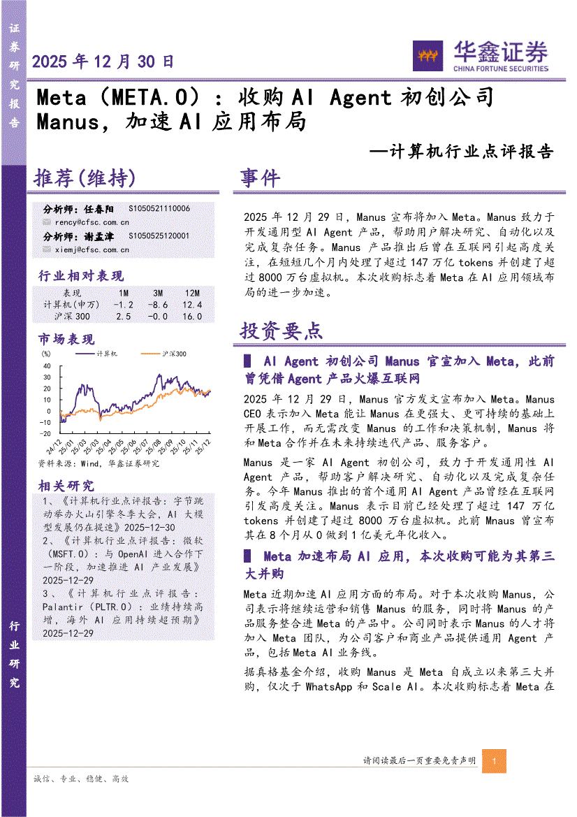 计算机行业:华鑫证券-计算机行业点评报告:Meta(META.O),收购AIAgent初创公司Manus,加速AI应用布局-251230