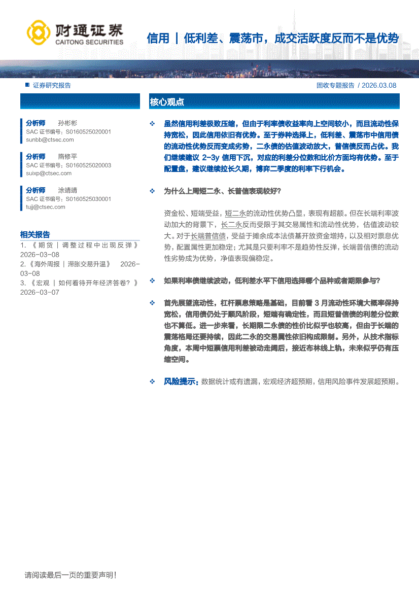 财通证券-固收专题报告:信用|低利差、震荡市,成交活跃度反而不是优势-260308