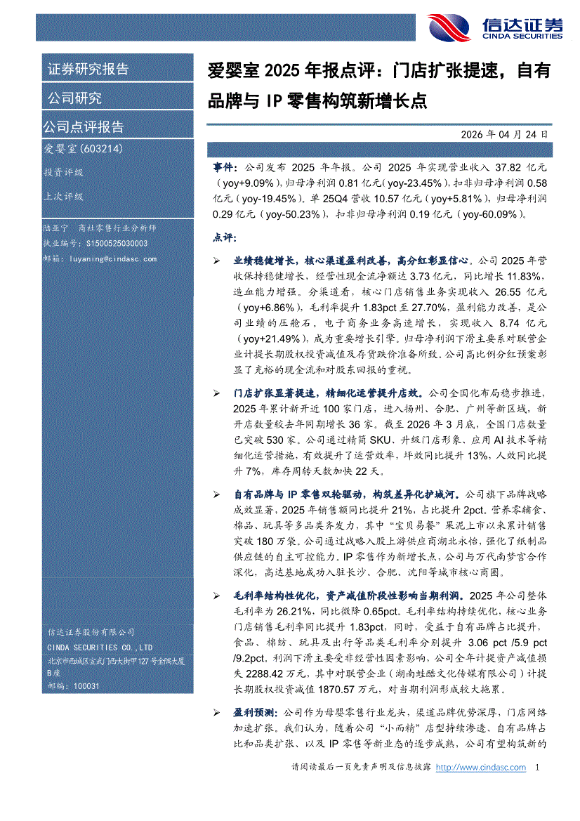 爱婴室:信达证券-爱婴室-603214-2025年报点评:门店扩张提速,自有品牌与IP零售构筑新增长点-260424