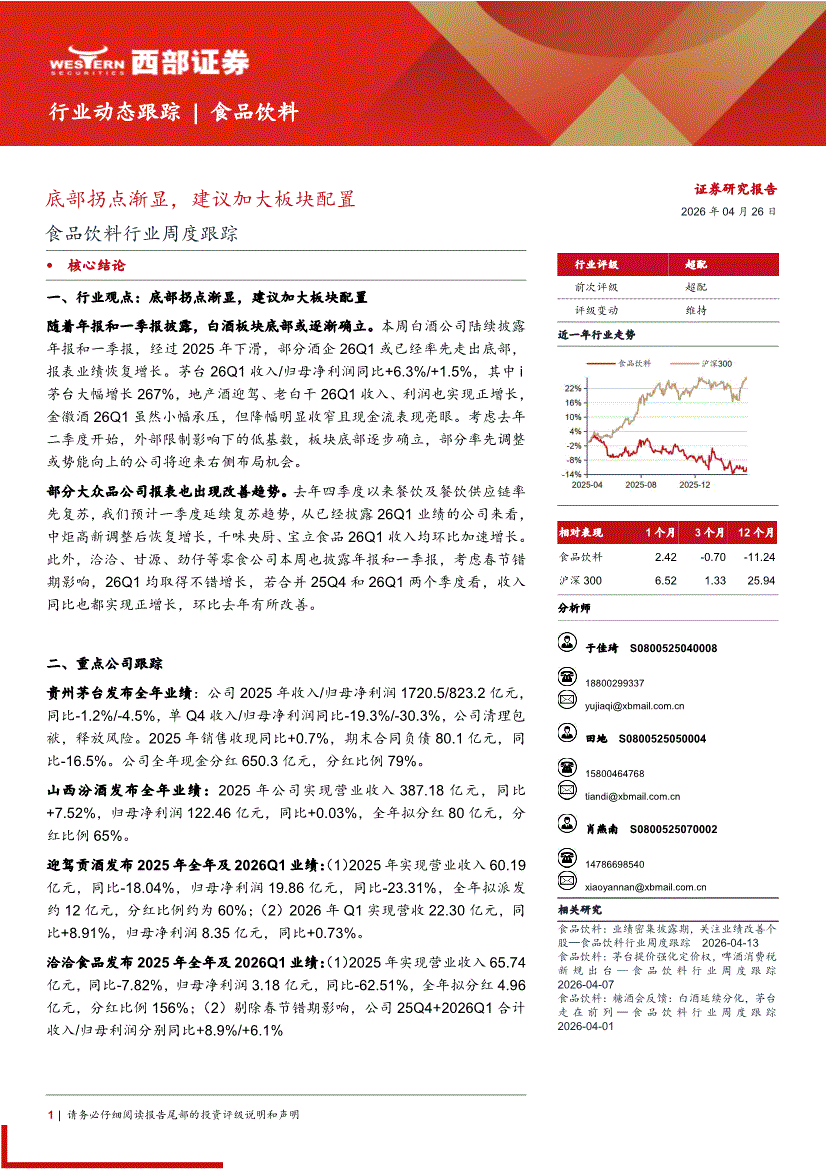 食品饮料行业:西部证券-食品饮料行业周度跟踪:底部拐点渐显,建议加大板块配置-260426