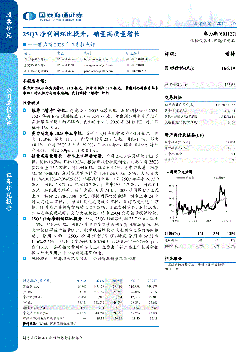 赛力斯:国泰海通证券-赛力斯-601127-2025年三季报点评:25Q3净利润环比提升,销量高质量增长-251117